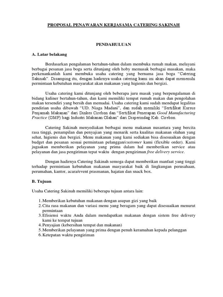Pendahuluan latar belakang pada saat ini banyak orang yang ingin membuat acara atau kegiatan secara simpel dan efisien. Pendahuluan latar belakang pada saat ini banyak . Contoh proposal kerjasama catering perusahaan. Contoh proposal penawaran kerjasama catering. Usaha katering rumahan saat ini cukup diminati karena kebutuhan akan makanan tidak pernah ada habisnya .