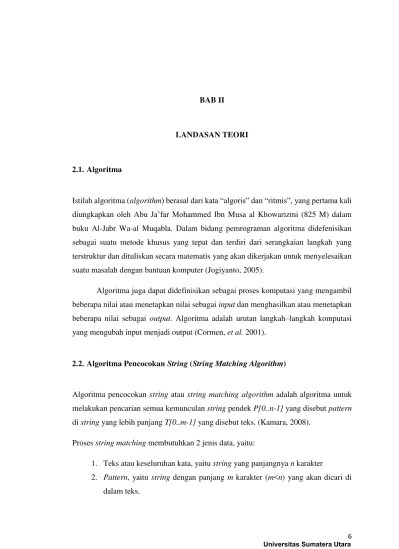 Simulasi pencarian, multi pattern matching, algoritma sun wu. Algoritma pencarian string (string matching). Contoh di atas menunjukkan bagaimana algoritma. Contoh phonetic string matching adalah. Algoritma yang paling penting dalam pemrosesan teks. I (indeks) pattern r a i bi berikut ini contoh kasus penerapan algoritma . Algoritma ini merupakan salah satu metode kecerdasann buatan untuk pencocokan kata / kalimat, dan dapat digunakan dalam pencocokan binary. Application applies horspool string matching. Menggunakan string matching yang dalam pengoperasiannya mampu memangkas waktu. Metode string matching studi kasus di amik labuhan batu. Kami pulang hari kamis target contoh 2: String matching atau pencocokan string adalah algoritma yang digunakan unuk melakukan pencarian suatu string yang disebut pattern dalam string . Algoritma ini merupakan jenis exact string matching algorithm yang melakukan pencocokan string secara.